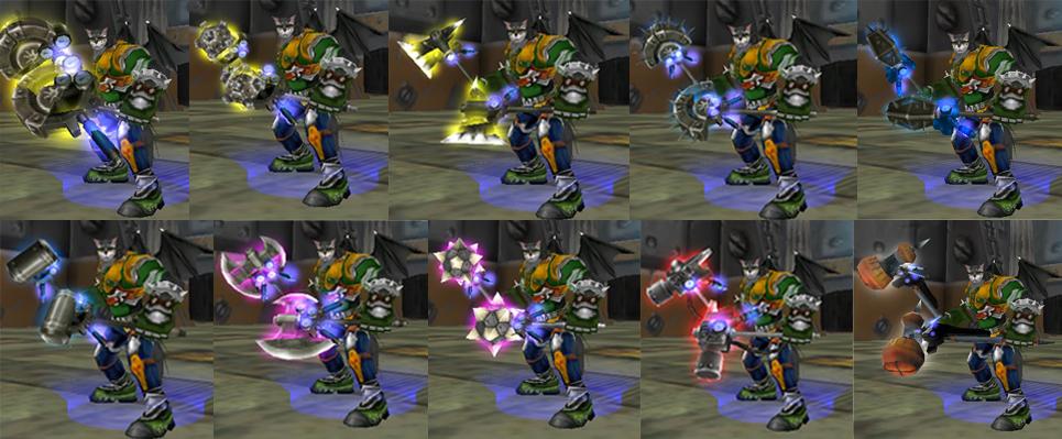 除了这些武器本身的基础攻击外还包括有攻击、力量、体力、防御、生命值、启用等级减5、攻击速度加20%、新蒸汽容量等共八种附加属性。而作为战士,攻击、力量、体力、生命值、防御、攻击速度等都属于比较重要的属性,而两把单手锤则能很好的使战士本身的属性更加多样化,一般来说在练级时攻击速度与攻击力是众多属性中的首选,而在PK时生命值、体力、攻击速度,甚至力量和防御都不错的属性。另外单手钝器还有一个其他任何武器都无法做到的优点,只有单手钝器和盾牌才能同时被玩家持有。